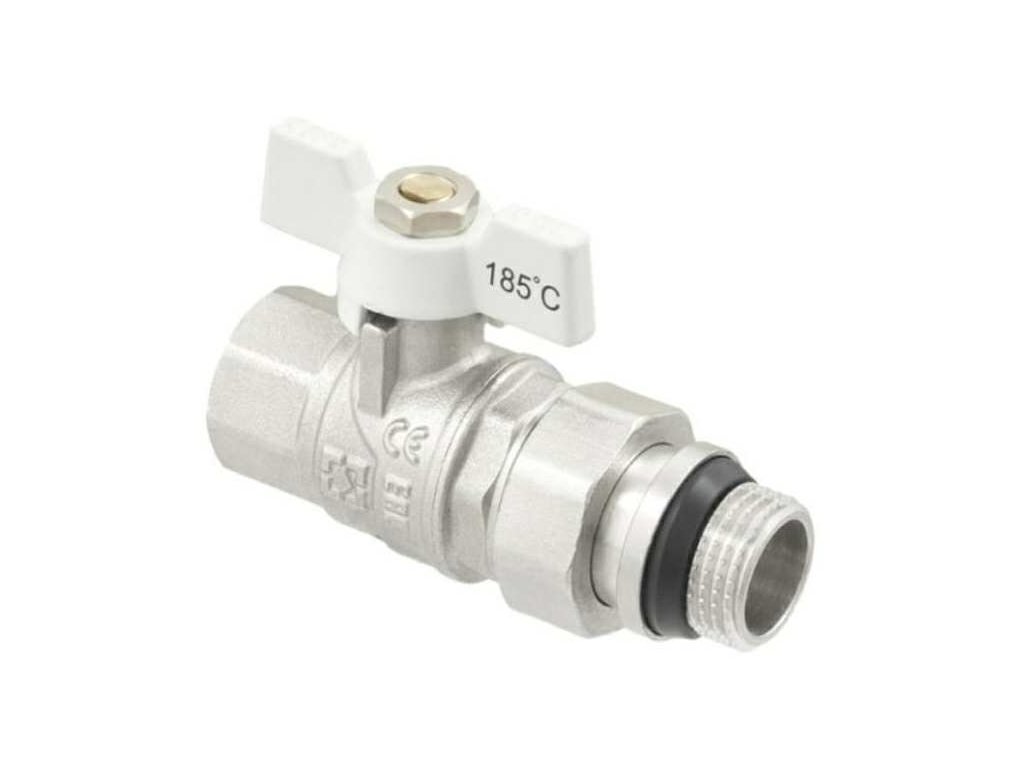 Kulový kohout se šroubením 1/2″ WHITE (RAFTEC, WRB‑1) je plnoprůchodný (~95 %) mosazný ventil s bílou motýlkovou rukojetí и kombinovaným závitem – vnitřní × vnější (FM), vybavený šroubením pro snadné instalace.