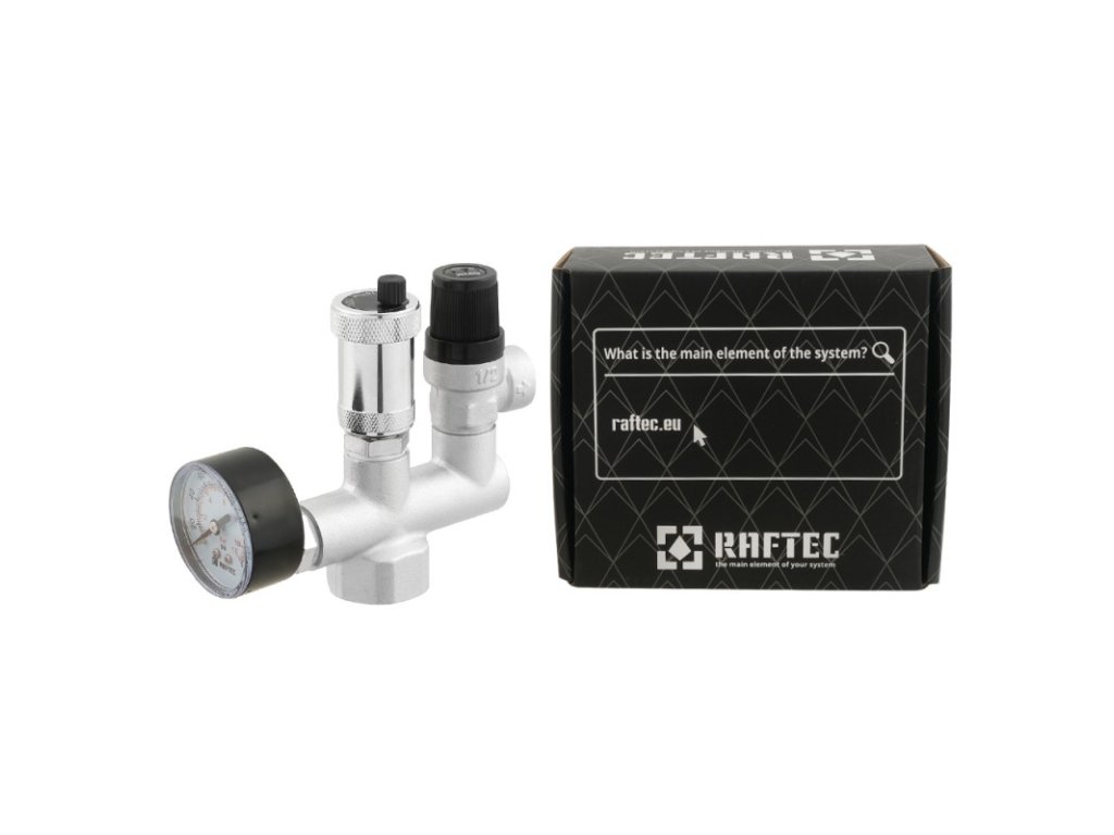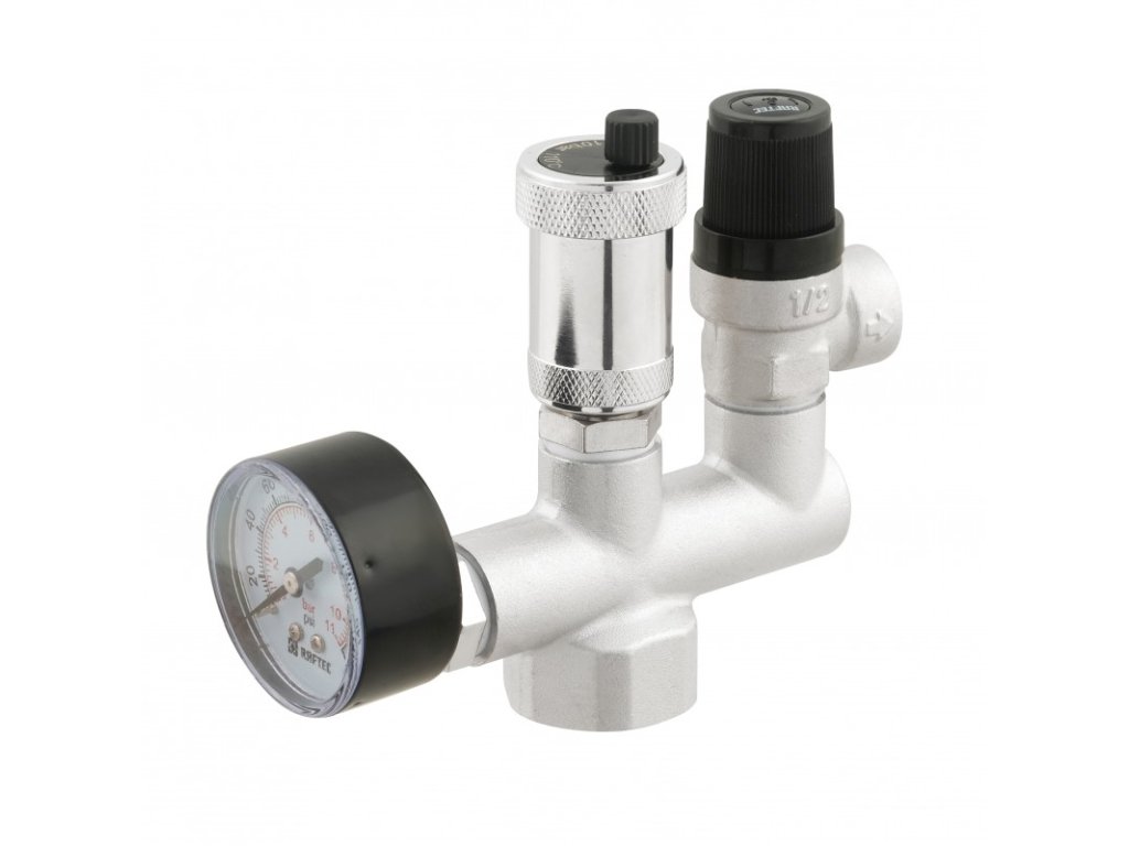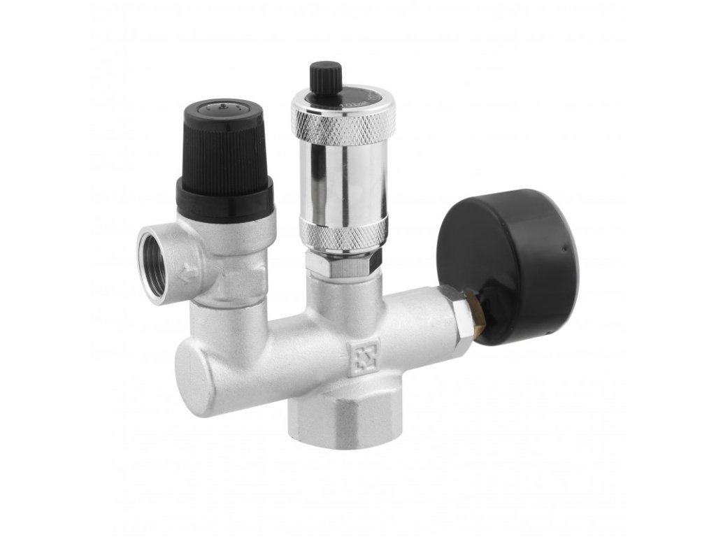 Bezpečnostní jednotka se skládá z přetlakového ventilu, automatického odvzdušňovacího ventilu a tlakoměru. Tato tři zařízení jsou instalována na jednom rozdělovači, který je připojen k topnému zařízení.