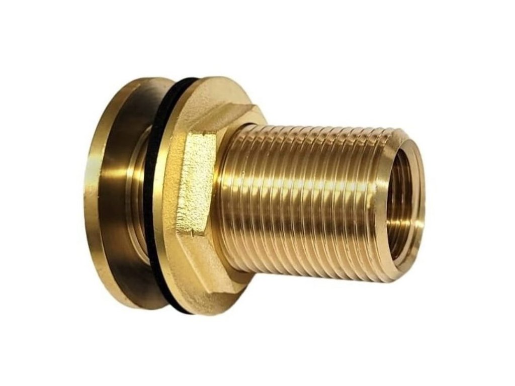 Mosazná průchodka k nádrži 1/2" × 3/8" (M-F) je závitová přechodka určená pro montáž do stěn nádrží, sudů nebo bojlerů. Umožňuje pevné a těsné připojení vývodu skrz stěnu nádoby. Na vstupu má vnější závit G 1/2", na výstupu vnitřní závit G 3/8". Součástí je těsnění.